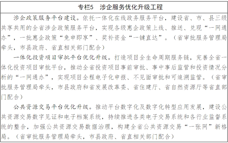 提供优质便利的涉企服务。深化企业开办“一件事”改革,推行企业登记注册“一网通、一窗办、半日结、零成本”,将登记注册、公章刻制、发票申领及银行、社保、医保、公积金开户纳入全流程管理,便利市场主体准入和退出。推行“一业一证”改革,深化“一照多址”“一证多址”改革,探索“多业一证”审批模式,推进企业年报“多报合一”改革。深化“互联网+不动产”登记改革,推进不动产登记、交易、缴税“一网通办”和“一窗办理”。深化“承诺制+标准地+全代办”改革,开展简易低风险项目“成交即发证、交地即开工、竣工即登记”改革,深化“多规合一”“多测合一”联合验收改革。聚焦企业注册登记和生产经营过程中用工、融资、税费、招标采购、知识产权、法律等服务,依托法人数据库打造企业全生命周期服务链。建设全省统一的涉企政策“一站式”综合服务平台,实现各级惠企政策上线、推送、兑现“一网通办”,一批惠企政策“免申即享”、奖补资金“一键直达”。