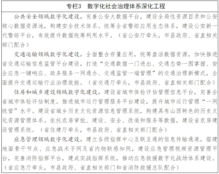 优化社会精细化治理体系。按照共建、共治的思路,加快推进社会治理领域数字化建设,加强公共安全视频图像智能化升级和数据共享利用,开展综治中心规范化建设,提升社会治安防控的整体性、协同性和精准性。深化智慧警务建设,加强各警种信息系统的整合与数据共享,建成省公安大数据智能化平台,构筑以数据为关键要素的治安防控模式。深化交通领域数字化建设,加强对交通运输业务的整合与数据共享,建成省交通运输信息监管平台,全面提升我省交通运输行业治理效能。深化住建领域数字化建设,建设完善“数智住房”“数智建造”“数智城乡”等“数智住建”全省一体化运行的住建业务管理平台,提升治理能力。