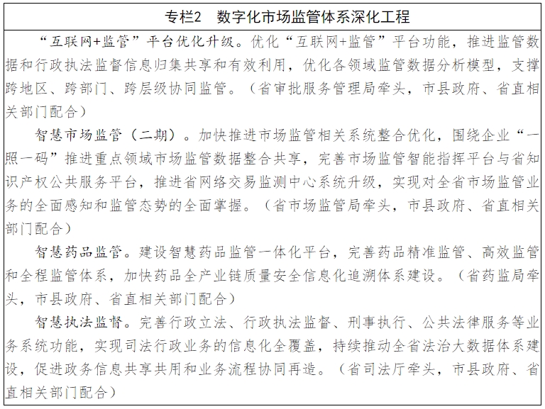 加强行政执法智慧监督。加快推进数字法治建设,不断完善行政立法、行政执法监督、刑事执行、公共法律服务等业务系统功能,实现司法行政业务的信息化全覆盖。逐步构建覆盖全省的法治大数据体系,推进执法监督数据整合共享,有序推动省行政执法协调监督系统与各类行政执法监督系统的对接共享,推动对监管执法全过程的数字化记录、追溯和监督。深化公共法律服务网络平台建设,不断提升公共法律服务智能化水平。