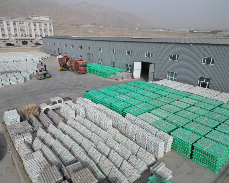 2月23日,在位于库尔勒上库综合产业园区的库尔勒胜农塑料制品加工厂,院内整齐存储着包装好的原料、农用地膜等产品,运输车正在装载外销地膜。