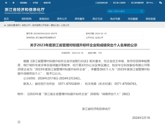近日,浙江经济和信息化厅公布了“2023年度浙江省管理对标提升标杆企业”名单。本次共拟定20家企业为“2023年度浙江省管理对标提升标杆企业”。