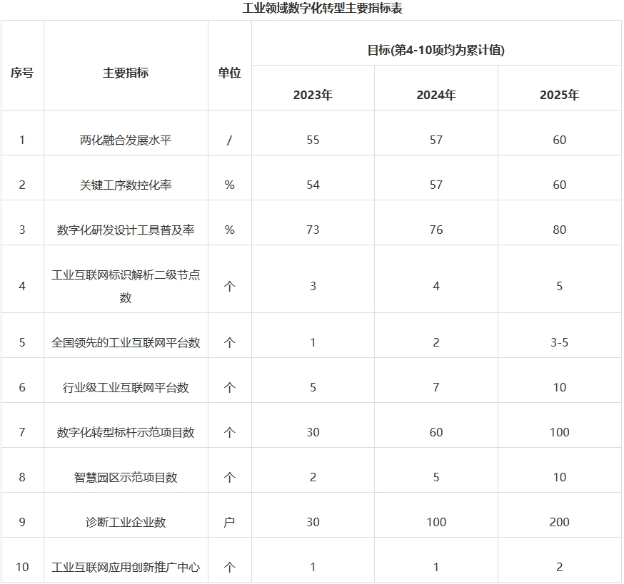 (二)发展目标。通过三年的努力,全省工业领域数字化转型水平显著提升,基础设施持续完善,融合应用广泛普及,创新生态不断健全,信息化和工业化在更广范围、更深程度、更高水平上实现融合发展。