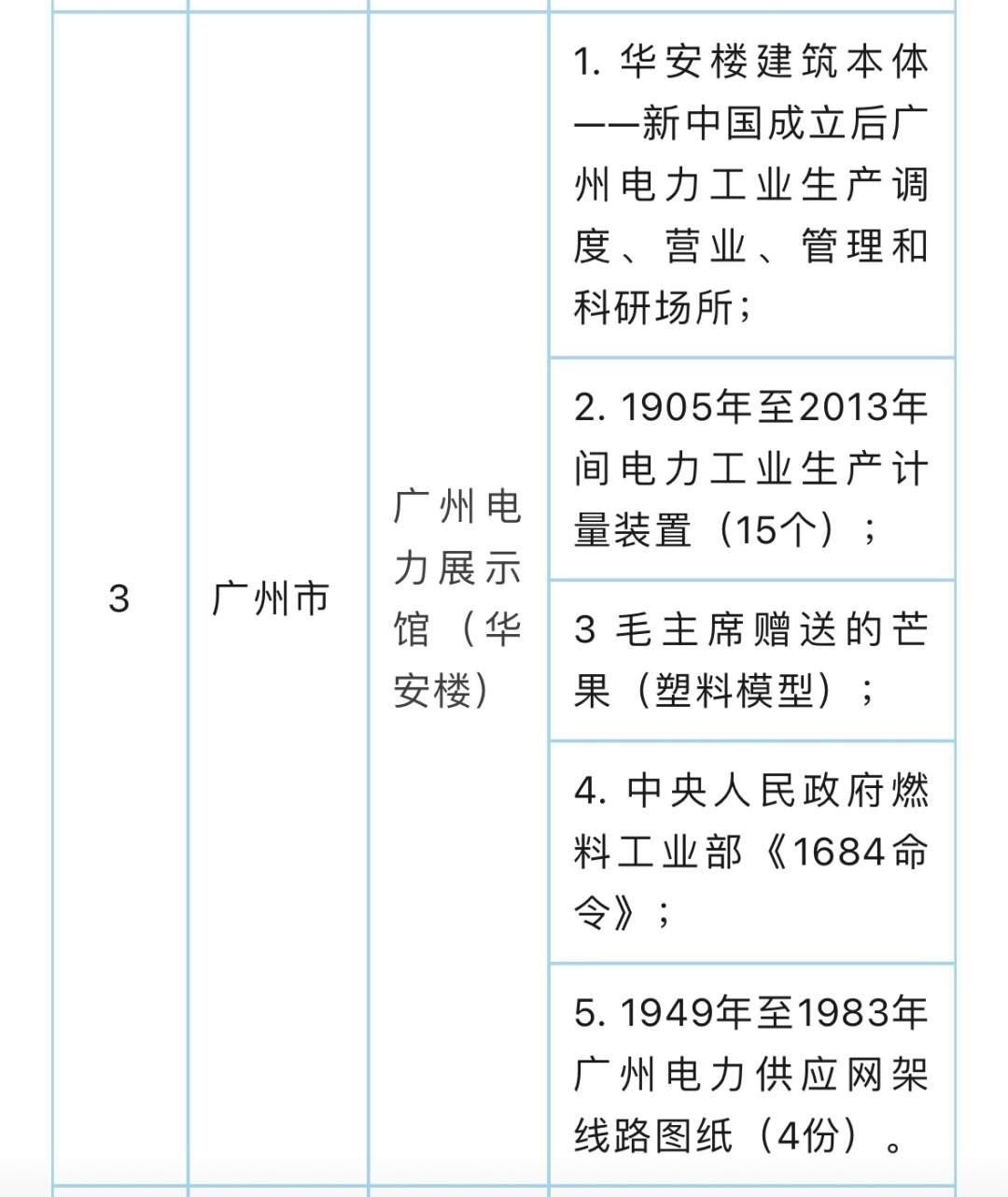 第三批广东省工业遗产名单共9个,其中,位于广州的中国船舶黄埔文冲文化园、亚细亚龙唛仓、广州电力展示馆(华安楼)入选。中国船舶黄埔文冲文化园内的柯拜船坞是外国人在中国投资建设的第一个船坞,也是中国近代第一座干石船坞,是中国第一支产业工人队伍的诞生地,标志着中国近代船舶修造业的发端。建于1936年的华安楼,目前已改造为广州电力展示馆,收藏了清朝、民国以及中华人民共和国成立后珍贵的电力工业相关物项,展示了中国电力工业发展史,发展了电力展览、研学教育、科技体验教育等多种功能,是全国电力系统少有的利用历史建筑、工业遗产活化改造为企业展馆的案例。