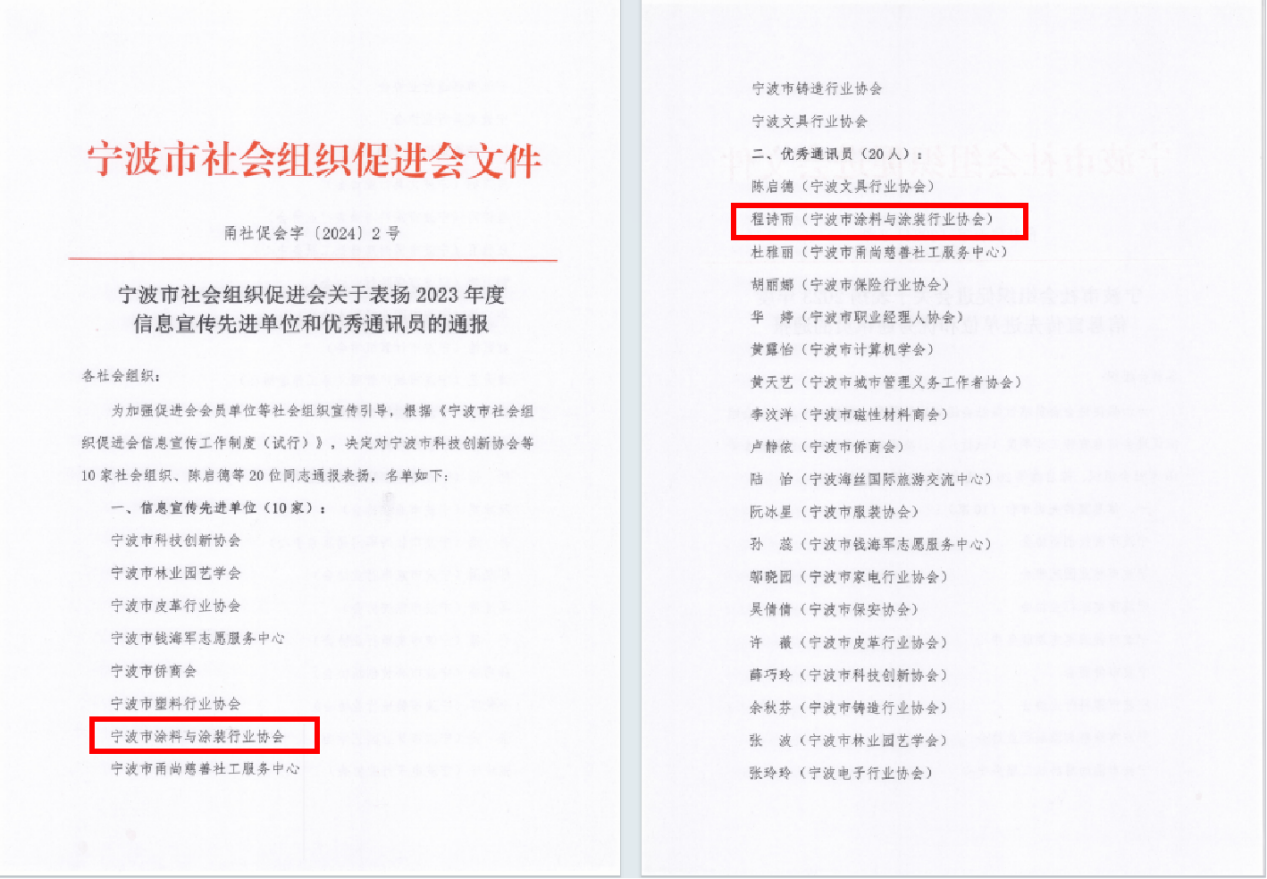 自2019年来,宁波涂协已连续五年荣获“信息宣传先进单位”和“优秀通讯员”荣誉,始终积极做好社会组织信息宣传工作,及时上报活动信息,展示活动成果,传播了协会的正能量。