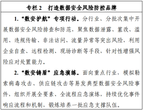 6.加强数据安全风险防控。完善工业领域数据安全风险信息报送与共享工作机制,组建数据安全风险分析专家组,动态管理风险直报单位库,协同加强地方力量,常态化开展风险监测、报送、预警、处置等工作。摸排数据安全风险事件特点和规律,建立重大风险事件案例库,加强案例剖析和风险提示。面向重点行业开展“数安护航”专项行动,定期组织“数安铸盾”应急演练,提升事件快速反应、规范处置、协同联动水平。