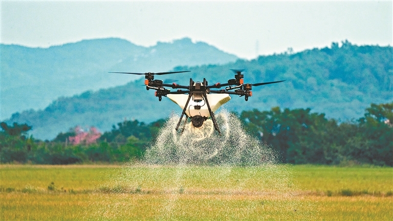 人勤春来早,春耕备耕忙。如今的广州田间地头满满“科技范”,各种高科技、智能化农业机具纷纷“上岗”。近日,记者在增城区朱村丝苗米现代农业产业园生产基地举办2024年春耕生产现场会看到,农业无人机正在空中来回飞翔,以13.8m/s全速飞行,短短11秒就可以撒完一袋肥料。“农民”只需提前在手机上设置好间距、速度、高度等各个参数,手机屏幕上一键点击,剩下的喷洒农药、化肥等工作就全都交给无人机了。极飞科技和产业园的现场工作人员还向记者展示了农机自动驾驶“神器”。“这台安装农机自驾仪的插秧机上,可以完全解放双手,实现机子全自动运作,一个人就能完成摆秧放秧,插秧速度还比此前的快了一倍。”广州市兴农农业服务有限公司的推广经理刘广镇表示。