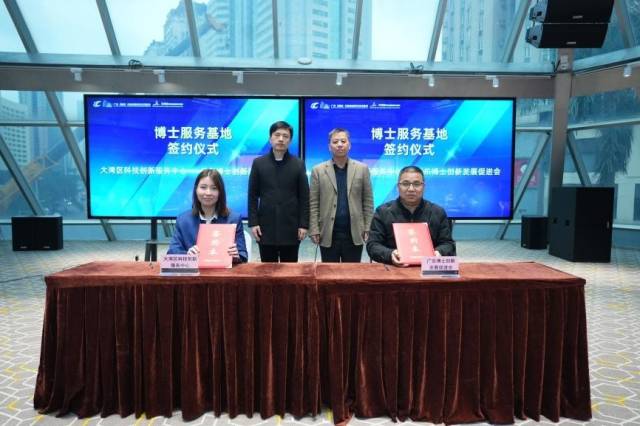 活动中,广东博士创新发展促进会与大湾区科技创新服务中心(下称“大湾区中心”)达成战略合作。双方将携手推动博士人才的发展和服务,促进高端人才在科技创新、产业发展和社会进步中发挥更大作用。此外,为了更好汇聚博士人才、助力企业创新、服务经济高质量发展,“博士服务基地”同步揭牌成立。