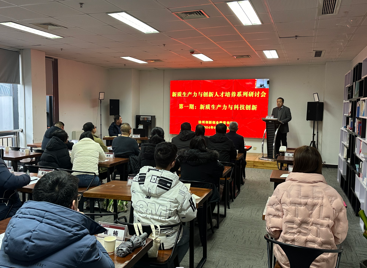 研讨会邀请了徐州市科技专家团副团长、徐州市科技局原副局长袁必佳先生做了题为“新质生产力与科技创新”的专题报告。袁必佳从新质生产力的提出及内涵、新质生产力与先进生产力、新质生产力与新兴产业、新质生产力与科技创新、新质生产力与科技创新的发展态势、关于促进新质生产力发展的几个问题六个方面向与会人员对新质生产力进行了全面系统的解读。强调新质生产力的核心要义在于科技创新,新质生产力是技术颠覆性突破、生产要素创新性配置、产业飞跃性升级带来的新时代先进生产力。并用大量的案例论证我们需要在创新人才培养上做更多的工作。