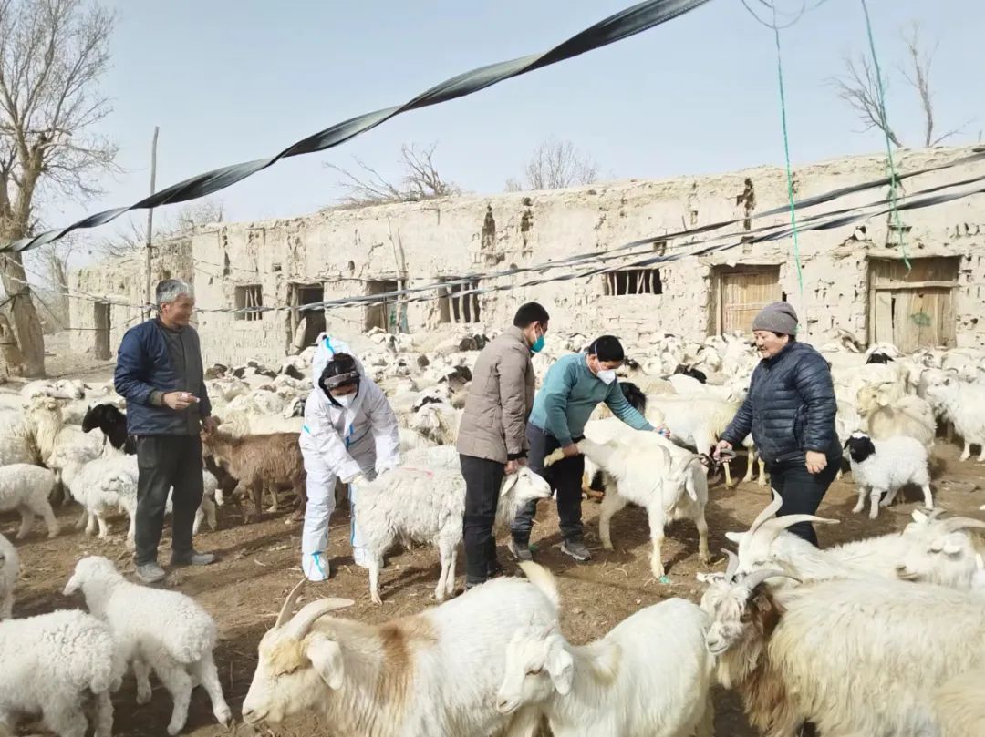 走进阿克苏普乡英巴格村养殖二区的圈舍内,乡兽医站兽医技术人员马依努尔·巴拉提正在查看牲畜生长情况,并向农牧民们讲解动物疫病防控知识。随后,村级防疫员们戴着口罩、手套、身穿防护服,为牲畜一一注射小反刍兽疫、口蹄疫苗两种免疫疫苗。
