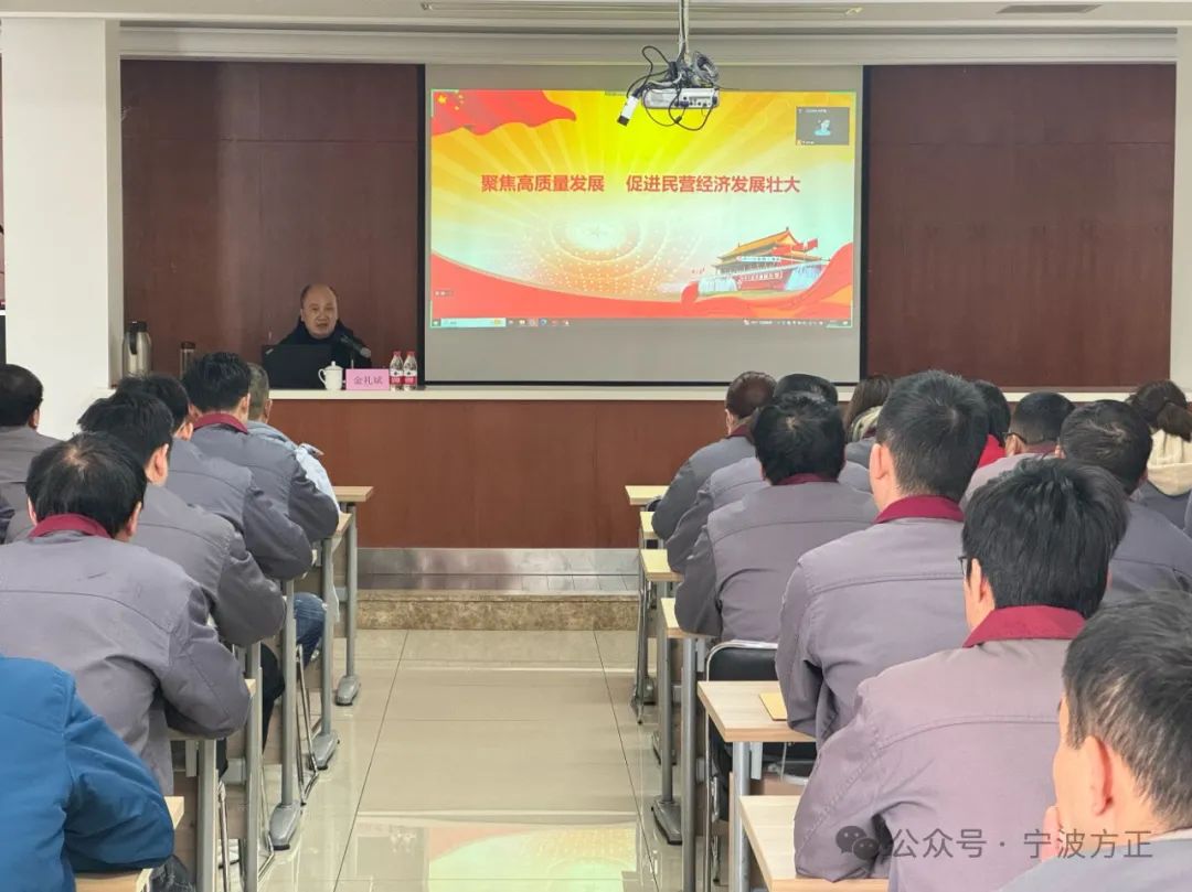 3月1日下午,宁波方正特邀中共宁海县委党校校长金礼斌为我司就“聚焦高质量发展,促进民营经济壮大”为主题开展专题讲座。对于全司广大党员和管理干部来说,这是增长见识、开拓视野、刷新认知、鼓舞信心的“新春第一课”,更似春风拂面,令人受益匪浅。