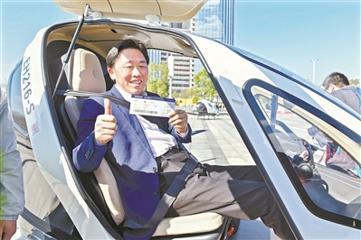 嘉宾体验亿航EH216-S无人驾驶航空器,并竖起拇指点赞。杨耀烨 摄