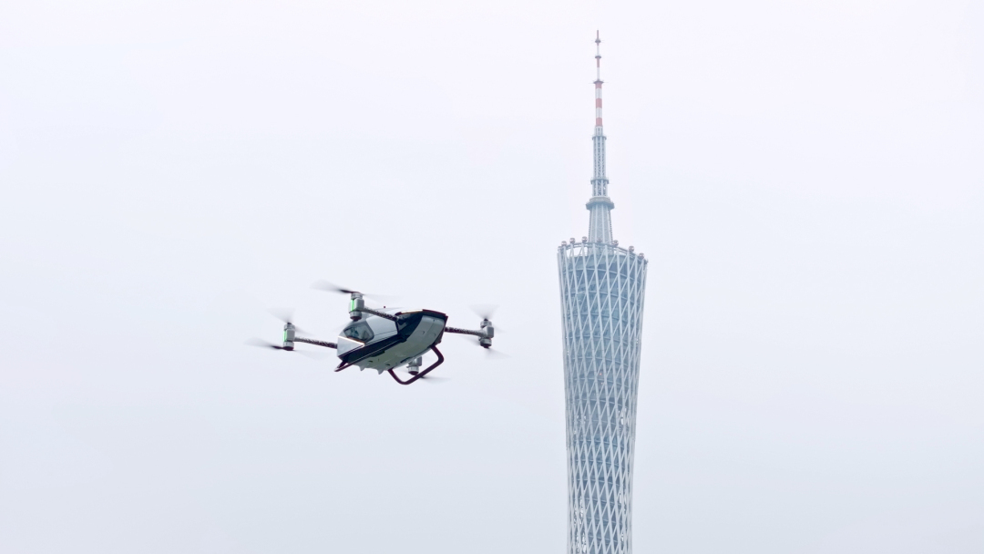 旅航者X2从天河区天德广场垂直起飞,通过自动驾驶模式,向标志性建筑广州塔方向飞行,横越广东省博物馆、花城广场、海心沙亚运公园等广州地标性景观。