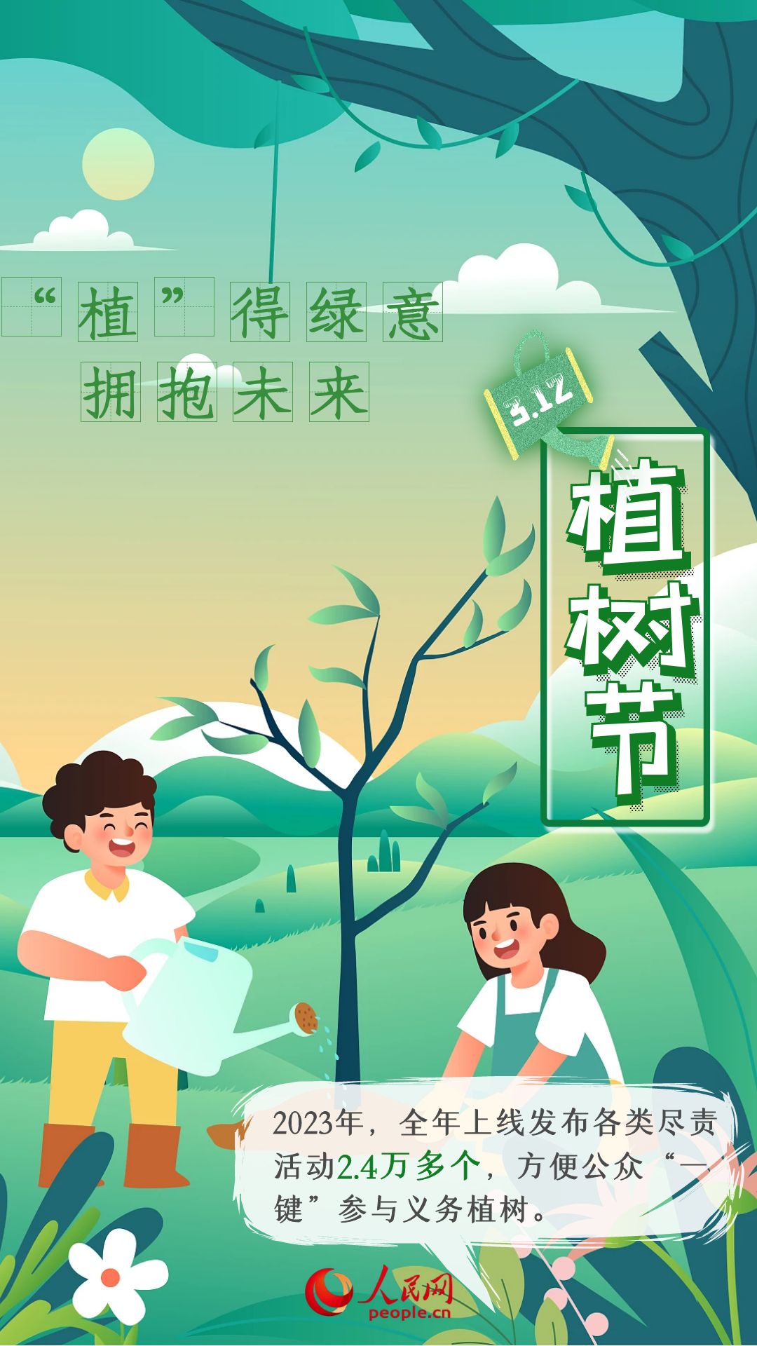 2024年3月12日是我国的第46个植树节。林草兴则生态兴。近年来,我国科学开展大规模国土绿化行动,取得明显成效,全民义务植树广泛开展。植树节不仅仅是一个节日,更是一种环保理念的传承和弘扬。让我们一起行动起来,为祖国添“绿”,为地球母亲播下一颗颗绿色的希望。