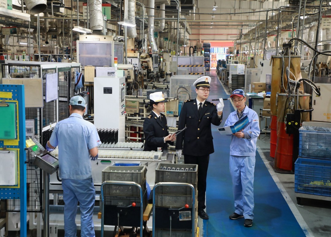 图为:广州海关所属花都海关关员前往汽车零部件制造企业调研并开展AEO政策宣讲。