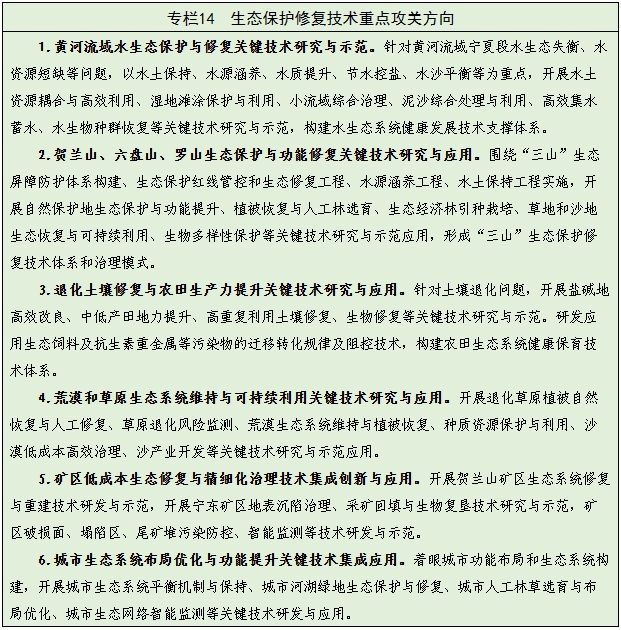1.生态保护修复技术创新。聚焦维护西北乃至全国生态安全所要承担的重要使命,瞄准自治区生态科研领域短板弱项,对标“一河三山”生态保护与修复科技需求,按照“一带三区”自然环境差异、生态平衡规律和产业发展特点,以森林、草原、湿地、流域、农田、城市、沙漠“七大生态系统”为重点,针对生态屏障功能弱化、水沙关系不协调、水源涵养功能退化,以及城镇化工业化引发的生态系统破坏问题,开展人工干预、保护、修复、重建、治理、监测等关键技术研究与应用,构建高效的生态保护与综合治理技术体系,支撑宁夏生态保护修复示范区建设。