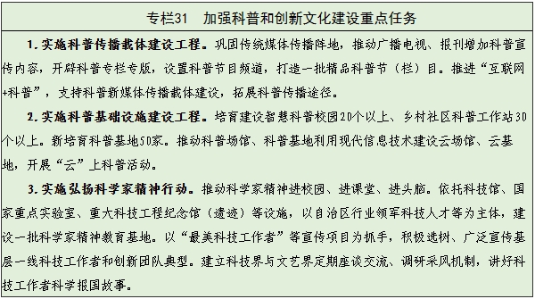 (五)加强科普和创新文化建设。坚持科学普及与科技创新位置同等重要,深入探索开展全地域覆盖、全领域行动、全媒体传播、全民参与共享的全域科普工作体系,构建政府引导、社会参与、市场运行、信息化支撑的大科普格局,厚植科技创新的社会基础,促进公民科学素质水平快速提升。