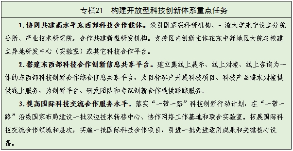 (一)构建开放型科技创新体系。坚定不移推动开放创新,加强东西部科技合作,拓展对外科技交流途径,构建协同创新共同体。