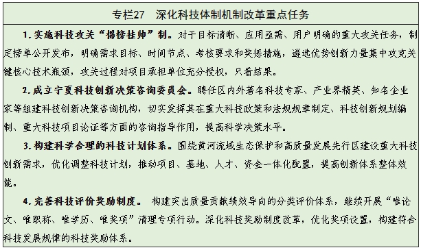 1.转变政府科技管理职能。全面深化科技体制机制改革,加强科技、人才、金融、产业、财政等领域政策协同。持续深化科技领域“放管服”改革,加快政府职能由科研管理向创新服务转变。完善自治区市县(区)协同创新联动机制,建立自治区科技部门与产业、行业部门和市县(区)政府创新联动会商机制,对市县(区)科技创新实行以奖代补。完善企业家参与科技决策机制,吸引更多企业家参与科技创新战略、规划、政策和立项评估等工作。充分发挥中国工程科技发展战略宁夏研究院作用,成立宁夏科技创新决策咨询委员会,完善科技专家库建设,构建多层次、全方位、专业化、高质量决策咨询体系。