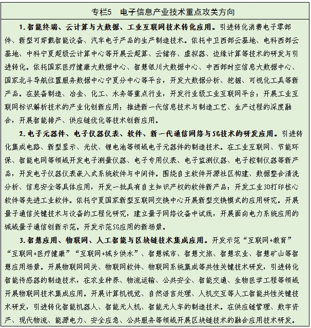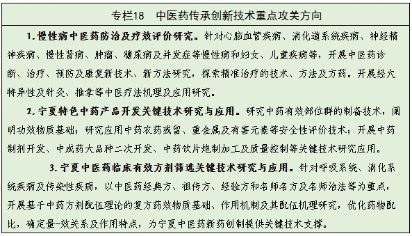 ——重点领域攻克了一批关键核心技术。聚焦自治区经济社会发展需求和科技创新短板,启动实施“五大科技创新行动”,在现代工业、现代农业和社会发展领域取得了一批重要技术成果,形成了一批“单打冠军”。“400万吨/年煤间接液化成套技术创新开发及产业化项目”获国家科技进步一等奖,一种旋流干煤粉气化炉(神宁炉)获中国专利金奖,铸造用工业级3DP打印设备整机打印效率达到进口机型的3倍以上,中国标准高速动车组铝合金枕梁成功应用于“复兴号”动车,超大口径调压装置关键用阀成为中俄输气管线“超级工程”的关键设备,特种变压器应用于“天宫一号”和“神州”系列飞船,高压交流快速真空开关开发应用,2000万吨智能综采输送装备填补了国内空白,成功研发600kg级蓝宝石晶体和N型单晶硅制备工艺。培育小麦、水稻、玉米、枸杞、马铃薯等新品种29个,优质高产奶牛早期选育技术、肉羊多性状基因聚合分子选育技术和滩羊种质基因鉴定技术达到国内领先水平,首次主导制定了《中医药—枸杞子》国际标准,攻克了枸杞多糖分离提纯活性低的技术难题,枸杞四大传统功效分子机制等重大基础研究取得突破。实施“宁夏脑计划”临床指导“颞岛癫痫”治疗取得重大突破,清醒麻醉状态下精准脑肿瘤切除术达到国际一流水平,神经胶原支架联合自体骨髓干细胞移植填补我区空白,区内医学团队首次证实乙脑病毒感染可能导致吉兰巴雷综合征。防治糖尿病药物羟苯磺酸钙实现了我区仿制药一致性评价“零”突破。