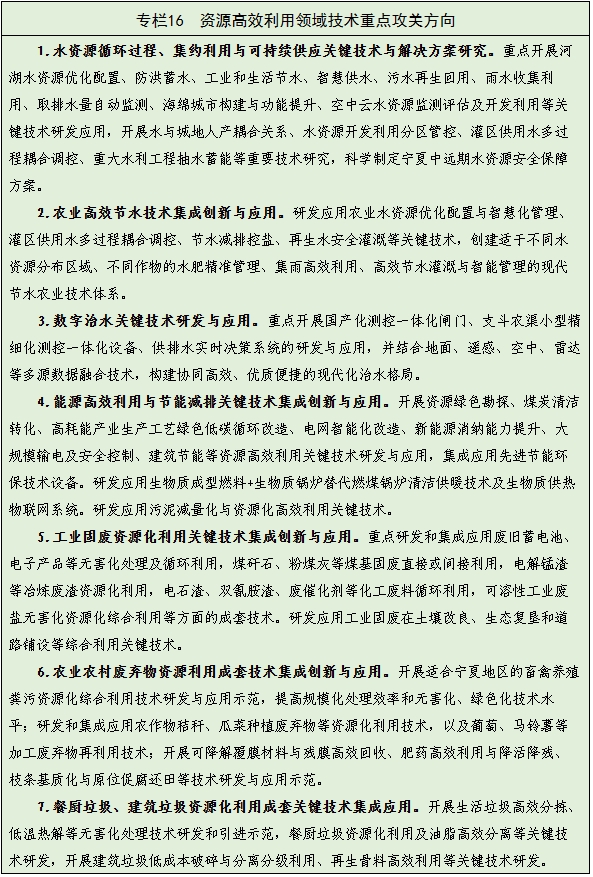 3.资源高效利用技术创新。坚持“以水四定”,以水资源、水生态、水环境和水灾害为重点,开展水资源高效利用、水生态与水环境的治理与保护、数字治水等现代水治理关键技术研究;坚持节约集约循环利用的资源观,以能源、土地资源节约利用、综合利用、高效利用为重点,针对工业单位能耗高、土地集约利用率低等问题,开展低碳减排生产、土地资源节约利用、废弃物资源化利用等关键技术研究与应用,构建资源高效利用和绿色低碳技术体系,支撑宁夏经济转型发展创新区建设。