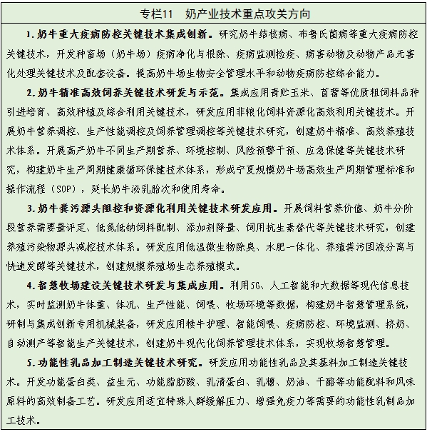 4.奶产业技术创新。围绕建设国际一流优质奶源生产基地和国内领先高端乳制品加工基地,打造“高端奶之乡”,针对奶牛利用年限短、重大疫病形势严峻、高值化乳品加工技术缺乏等问题,重点开展优质高产奶牛重大疫病防控、优质饲料供应与精准营养、健康养殖、特色高端乳品开发等关键技术研究与示范。