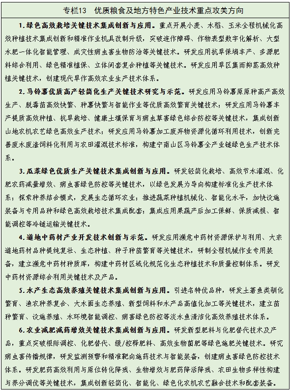 6.优质粮食及地方特色产业技术创新。围绕水稻、小麦、玉米、瓜菜、马铃薯、饲草、小杂粮、黄花菜等优质特色作物及道地中药材的提质增效和产业升级中的重大科技需求,重点开展农作物连作障碍防治、肥药精准化管理、成灾性病虫害综合防控、旱作区集雨抑蒸水分高效利用及农艺农机融合等关键技术研发与应用,创建全产业链优质、高效、绿色、轻简化生产技术体系和模式,支撑我区优质粮食及特色产业高质量发展。