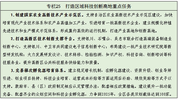 1.推动高新技术产业开发区创新发展。制定出台自治区推动高新技术产业开发区高质量发展政策意见,实施自治区高新区创新发展能力提升行动,按照“发展高科技、实现产业化”方向,优化创新生态,集聚创新资源,增强发展新动能,培育具有核心竞争力的创新型产业集群。推动银川、石嘴山国家高新区抓改革、激活力,补短板、强弱项,努力在国家高新区中争先进位。推动吴忠等自治区高新区升级为国家级高新区。支持区内高新区与东部高新区结对共建,提升创新发展能力。支持阅海湾中央商务区、中关村双创园围绕“互联网+”制造、医疗、教育等领域开展跨界产业制度创新试验,建设全国新经济制度创新高地。推动宁东、苏银、中卫、平罗等自治区高新区大力培育科技型企业,加快完善创新创业服务体系,培育壮大高新技术产业,形成经济高质量发展的增长极。强化高新区所在地政府主体责任,因地制宜赋予高新区经济管理权限,全面推行“管委会+公司”模式。建立以创新驱动和质量效益为导向的高新区考核评价指标体系,实行分类考核、动态管理,引导更多工业园区向高新区转型,争取2025年自治区高新区达到10家以上,实现地级市全覆盖。