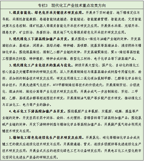 2.现代化工产业技术创新。围绕加快煤炭资源高效清洁转化利用、打造现代煤化工产业示范区的需求,重点开展煤炭智能绿色开采关键技术研发及集成应用,研发应用适用于煤层赋存条件的智能技术和装备,开发现代煤化工下游高附加值产品,研发应用煤化工废渣处置与资源化综合利用技术,研发应用煤转化高盐、高浓有机废水净化低能耗低成本技术,持续开展现代煤化工产业化关键技术集成与优化,推动我区现代煤化工产业做优做强;重点开发电石化工下游高附加值产品,集成应用绿色化、连续化生产技术,推动我区电石化工等传统化工产业精细化转型发展。