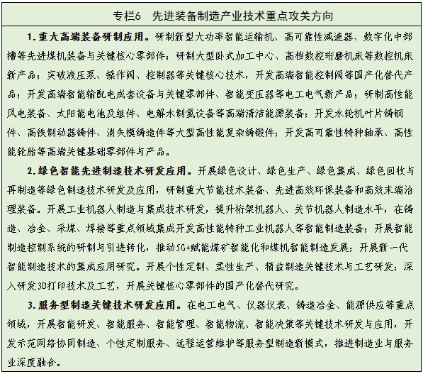 5.先进装备制造产业技术创新。围绕推动我区先进装备制造业的高端化升级、绿色化发展、智能化转型和数字化赋能的需求,研制一批技术领先、市场竞争力强、实现国产化替代的重大高端装备产品,研发应用一批绿色化智能化先进制造技术,开发示范服务型制造新模式,推进装备制造产业价值链向中高端迈进。