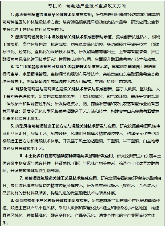 3.葡萄酒产业技术创新。围绕打造贺兰山东麓“葡萄酒之都”,针对贺兰山东麓葡萄酒风格特征典型性弱、酿造成本偏高等问题,重点支持开展防霜冻抗寒旱、生态化智慧化种植和酿造等关键技术研究与应用,筛选具有地域特征的优良本土酿酒酵母和乳酸菌菌种,建立具有核心品质组分积累的关键靶向栽培调控与定向酿造技术支撑体系,固化贺兰山东麓产区葡萄酒风格类型,开发适合国人不同口味需求的多元化葡萄酒产品。