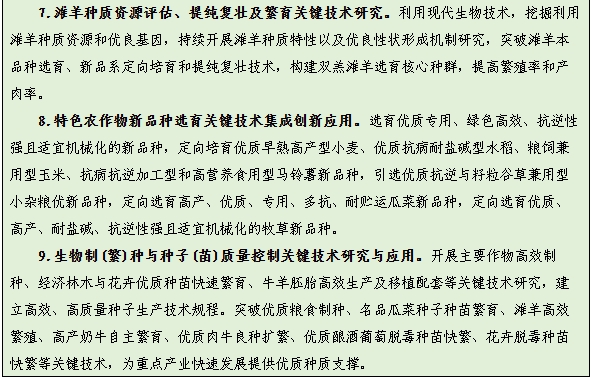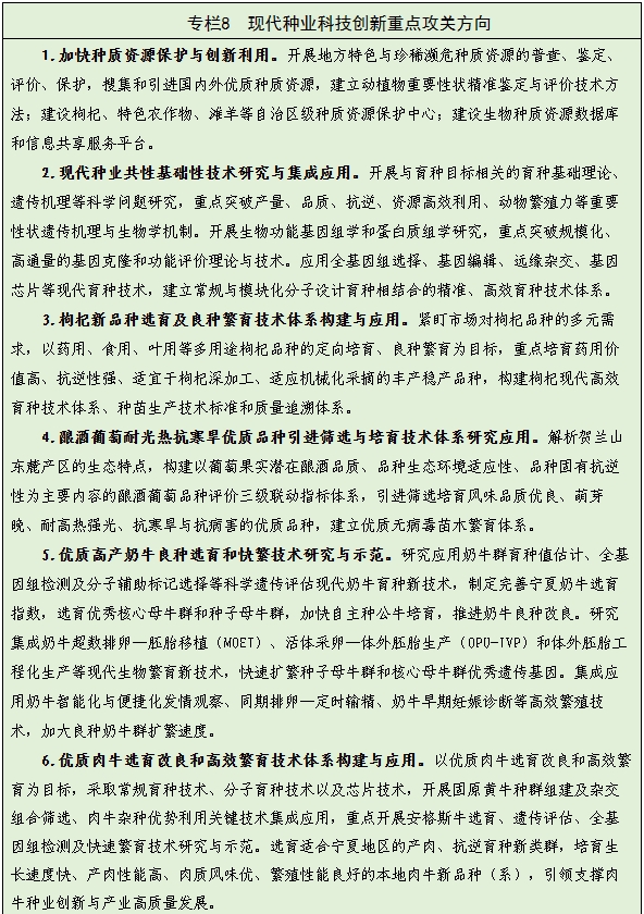 1.现代种业科技创新。实施种业科技创新行动,优化农业特色优势产业新品种选育专项。加强种质资源收集保护与评价,应用现代生物技术培育农作物、枸杞、酿酒葡萄、瓜菜、马铃薯、牧草等高产优质高抗新品种(系);建立奶牛遗传改良、肉牛杂种优势利用、滩羊优新品系定向培育技术体系。坚持自主培育与引进筛选并重,加快优新品种繁育和推广,加强地方品种种质库建设,改善种业科研机构研发条件,建立企业、科研单位联合攻关机制,培育领军企业,构建育繁推一体化的现代种业科技创新体系。