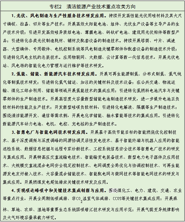 1.清洁能源产业技术创新。抓住碳达峰碳中和给清洁能源发展带来的机遇和挑战,围绕高水平建设国家新能源综合示范区、打造全球最大光伏全产业链基地需求,开展光伏与风电制造技术、生产性服务关键技术研发应用,加快发展壮大清洁能源制造业及服务业;开展氢能、储能、新能源汽车关键技术研发应用,加快扩展清洁能源应用新领域;开展新能源智能运维、智慧电厂与智能电网关键技术研发及集成应用,加快提升能源供应的基础能力。