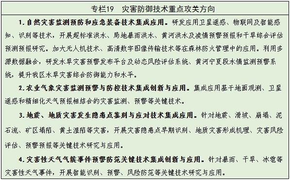 2.灾害防御技术创新。围绕自然灾害防治开展技术研究,推进大数据、云计算、5G移动通信等新技术在关键环节的广泛应用,加强灾害监测预警、风险与损失评估、社会影响评估、应急处置与恢复重建等关键技术的集成创新与应用。