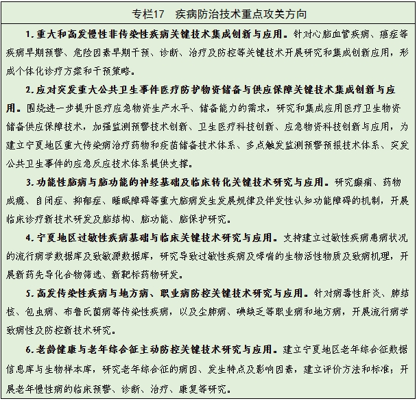 疾病防治。围绕健康宁夏建设,聚焦重大慢病、宁夏地区高发病地方病、妇女儿童和老年疾病开展防治技术攻关及临床转化,推动生物技术、再生医学、精准医疗、互联网、大数据、人工智能等新技术在疾病防控、医疗救治中的集成创新与应用,加强医疗救治研究体系建设,促进宁夏临床诊疗水平提升。