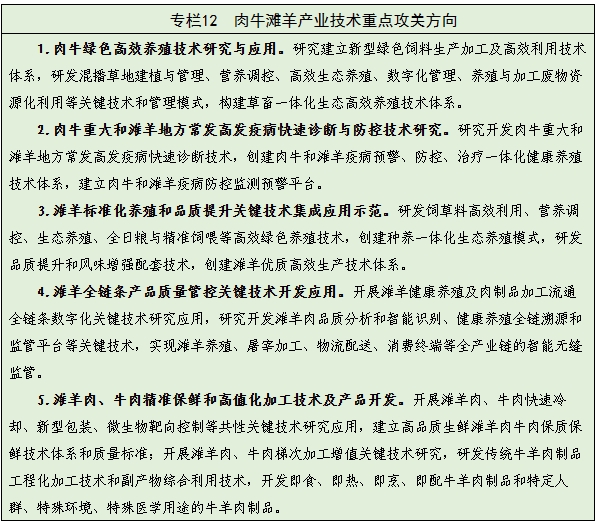 5.肉牛滩羊产业技术创新。围绕打造“高端肉牛生产基地”和“中国滩羊之乡”,针对精准养殖技术水平不高、精深加工水平不高等突出问题,重点开展高效生态养殖、疫病防控、舍饲健康高效养殖、牛羊肉精深加工和冷链保鲜、养殖与加工废物资源化利用等关键技术研发,创建肉牛滩羊绿色优质高效生产技术体系。
