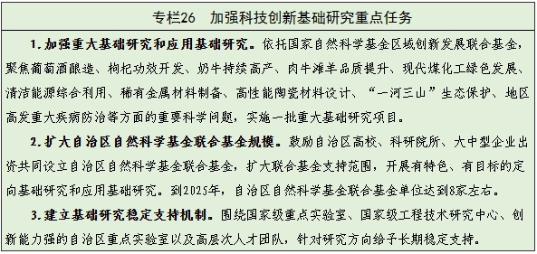 1.优化基础研究体系布局。统筹国家和自治区自然科学基金,解决科技创新“最先一公里”问题。国家自然科学基金区域创新发展联合基金聚焦自治区新型材料、先进装备制造、生物与农业等重点产业和生态环境、人口健康等重点领域的重大科学问题,集聚区内外优势科研力量实施一批重大基础研究和应用基础研究项目,为产业高质量发展提供科技创新源头供给;自治区自然科学基金着力于稳定、培养中青年科技创新人才,支持开展持续性和“非共识”基础研究,鼓励自由探索。发挥高校、科研院所基础研究主力军作用,推动基础学科与应用学科的统筹协调发展,促进数学、物理、化学、生物等重点基础学科和交叉学科发展。发挥科学家在基础研究选题中的作用,建立目标导向和自由探索相结合的基础研究项目形成机制。