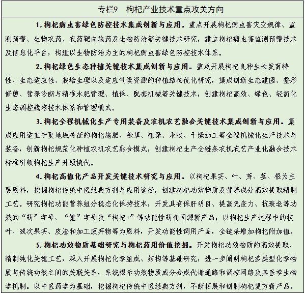 2.枸杞产业技术创新。突出“枸杞之乡”战略定位,引领枸杞产业向价值链中高端迈进,针对枸杞病虫害绿色防控技术薄弱、高值化产品开发技术滞后等突出问题,重点开展生态种植、病虫害绿色防控、全程机械化生产及农机农艺融合,高附加值医药原料和产品创制、功能性食品开发等技术研发。