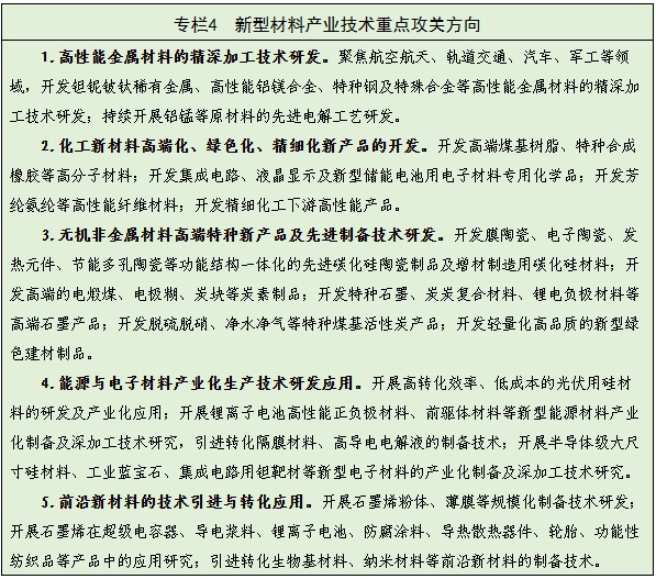 3.新型材料产业技术创新。围绕打造在西部有一定影响力的新型材料生产研发基地的需求,大力发展高纯度、高强度、高精度、高性能的新型材料,重点研发应用高性能金属材料的精深加工关键技术,开发化工新材料高端化、绿色化、精细化新产品,开发无机非金属材料高端特种新产品及先进制备技术,研发应用能源与电子材料产业化生产关键技术,加快前沿新材料的技术引进与转化应用。