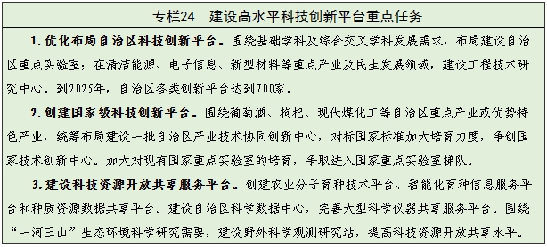 1.提升科技创新平台建设水平。围绕产业链和优势特色学科部署创新平台,支撑高质量发展。聚焦优势学科、基础学科、交叉学科发展需求,布局建设自治区重点实验室,支持有条件的高校、科研院所争创国家重点实验室。吸引聚集高层次科技人才,提升原始创新能力,推进基础研究和应用基础研究,增强产业技术创新后劲;在电子信息、新型材料、清洁能源、绿色食品、枸杞、葡萄酒等重点产业及社会发展领域,统筹布局自治区工程(技术)研究中心、企业技术中心,开展关键共性技术和产品研发、成果转化及应用示范;在链条长、规模大、集聚度高的产业,系统谋划建设产业技术协同创新中心,开展全链条协同创新,争创国家技术创新中心;支持企业建设自治区技术创新中心,开展技术集成应用和成果引进转化,提升企业技术创新水平;提升临床医学研究中心水平,推动医学科技成果转化推广和普及普惠。
