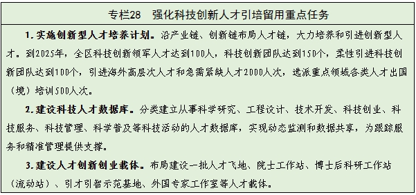 1.完善科技人才培养机制。按照创新型、应用型、技能型人才培养导向,整合优化各类人才培养工程。建立自治区创新人才信息库,大力实施科技创新领军人才、青年拔尖人才、青年托举人才等创新人才培养计划,形成各类科技人才衔接有序、梯次配备、合理分布的格局。围绕重点产业领域,加强基础研究人才培养和高水平科技创新团队培育组建工作。实施创新团队攻坚计划,每年遴选一批产业关键共性技术需求,安排专项资金组织科技创新团队集中攻关,破解一批技术瓶颈。坚持沿产业链、创新链布局人才链,推进项目、平台、人才一体化统筹布局。开展“人才+产业”行动计划,建立“政府出钱、企业育才”的人才培养储备机制。加大对优秀青年科技人才发现、培养和资助力度,形成适合青年科技人才成长的机制。优化高等院校学科和专业设置,建立与自治区高质量发展需求相适应的人才培养体系。实施知识更新工程,壮大专业技术人才队伍和高技能人才队伍。