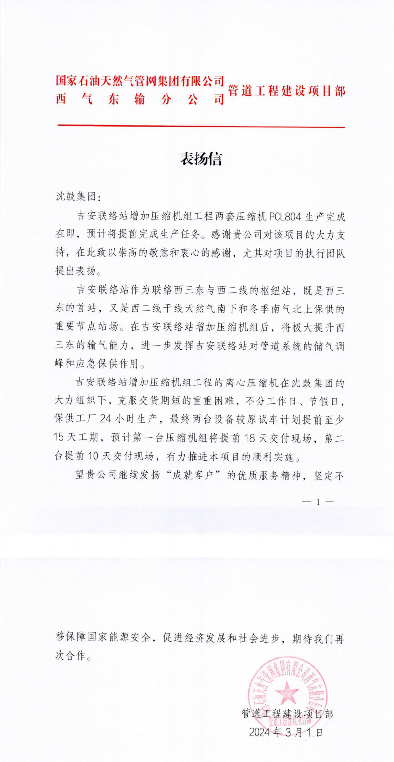 近日,国家管网集团管道工程建设项目部给沈鼓集团发来表扬信,对沈鼓集团为吉安压气站提供的两台离心压缩机在工厂一次完成测试通过,并能提前交付现场“致以崇高的敬意和衷心的感谢”,特别对该项目的执行团队提出表扬。同时,用户在内网新闻通讯中对该产品性能给予了高度评价:其具备运行效率高效、稳定可靠性出色等多项性能优势,为天然气输送压缩机组树立了新的标杆……经测试,机组效率、振动等关键性能指标达到了行业领先水平。