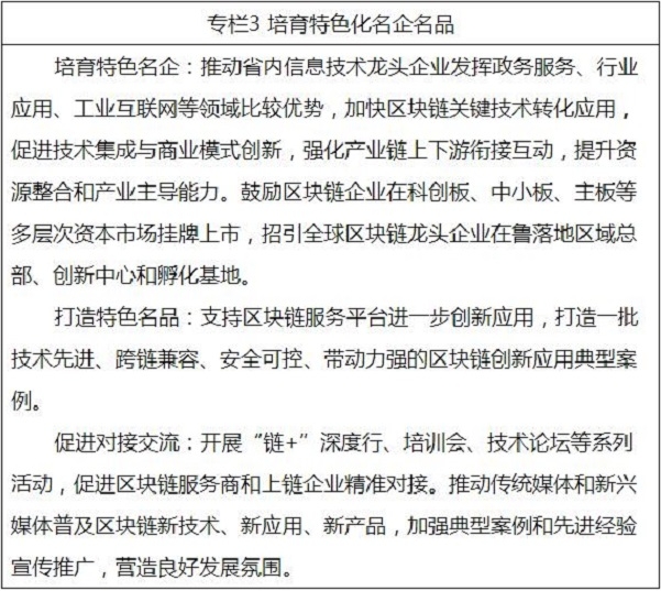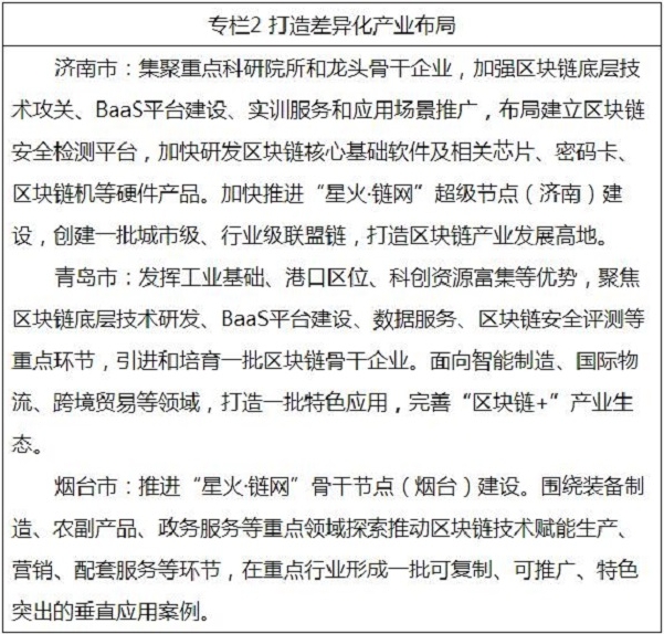 2.加快布局特色产业。推动有条件的市聚焦区块链技术产业化、特色化应用,打造一批基于特定行业、特定场景的垂直应用案例,形成差异化发展路径。支持区块链创新企业集聚、产业特色突出、人才优势明显的区域,加快布局建设一批产业园区和集群。(省发展改革委、省工业和信息化厅)