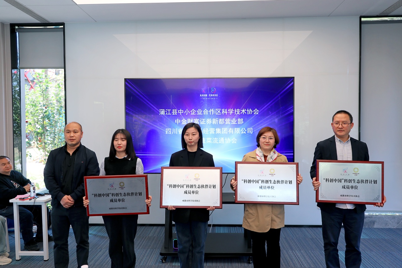 现场,市科协为蒲江县中小企业合作区科学技术协会、中金财富证券新都营业部、四川省农产品经营集团有限公司和四川省蔬菜流通协会4家成都市"科创中国"科创生态伙伴计划企业进行了授牌。