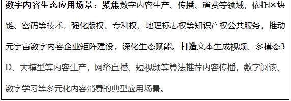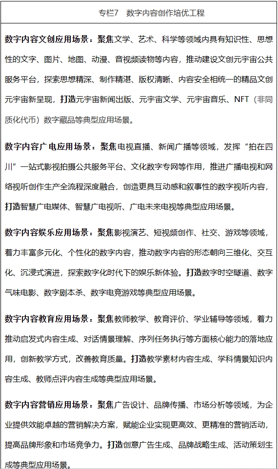 11.数字内容创作培优工程。加速数据合成、3D场景生成、沉浸式音视频编辑制作等数字内容产业化,拓展数字内容场景应用,塑造“元宇宙四川”数字内容创作品牌。支持发展PGC(专业生成内容)、UGC(用户生成内容)、AIGC(人工智能生成内容)等多层次内容生产模式,充分运用中华文化数据库的优秀文化素材,弥合优质数字内容供需鸿沟,打造新的数字内容生成和交互形态,健全元宇宙产业要素生态。