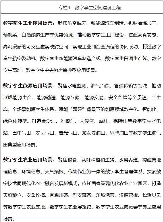 8.数字孪生空间建设工程。面向工业、农业、文旅、交通、水利、城市建设等领域,建设虚实映射、高度协同的数字孪生平台,形成行业领域内统一的开放数据接口和连接标准,开展3D场景级、部件级数字孪生空间建设,实现物理空间和数字空间的同步运行、虚实互动,打造一批“元宇宙四川”数字孪生空间典型应用场景。