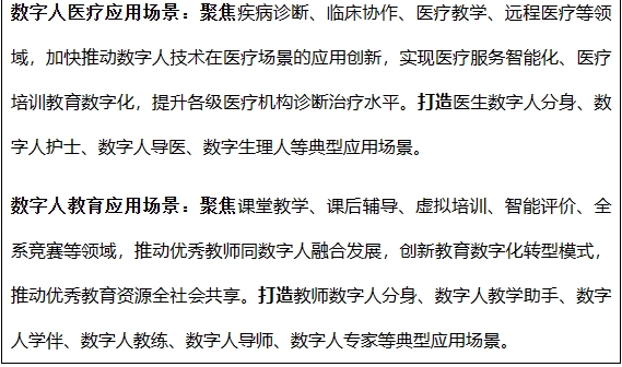 9.数字人新应用拓展工程。深化人工智能大模型应用,推动提升数字人在外观形象、人格塑造、表达交互等方面的模仿程度。鼓励发展功能型、实用型、服务型数字人应用,讲好四川故事,打造“元宇宙四川”数字人品牌,加快推动数字人分身、数字机器人、数字虚拟人等数字人形式在服务咨询、教育培训、演艺娱乐、医疗健康等领域的落地应用。