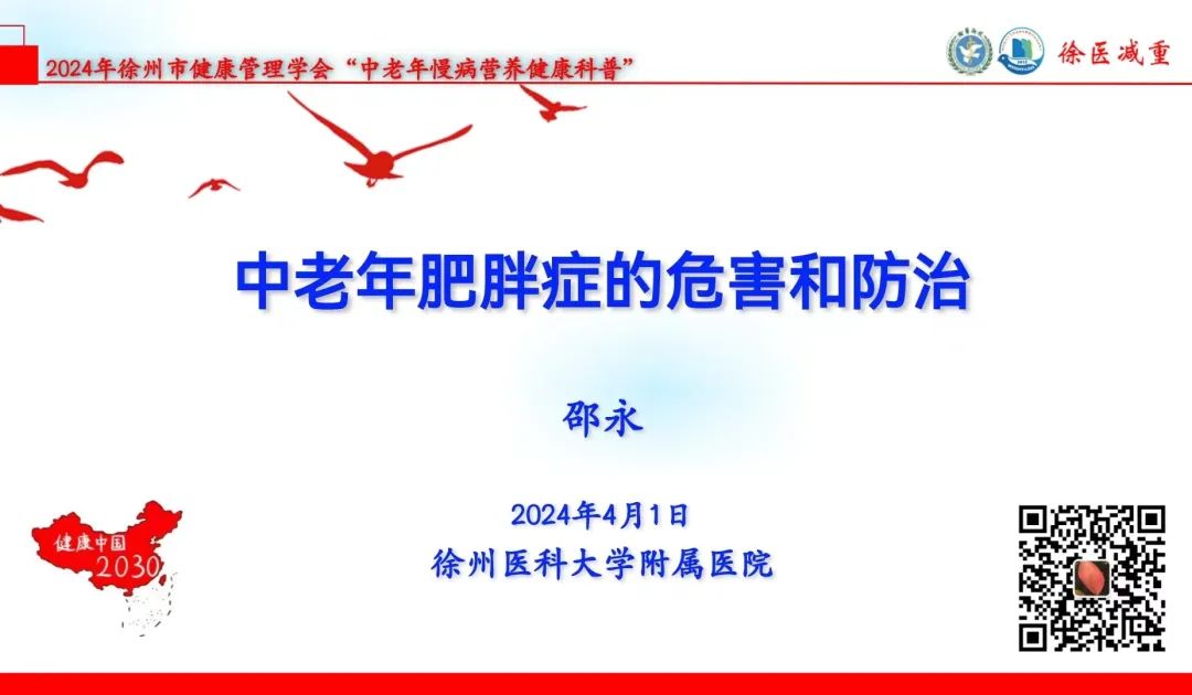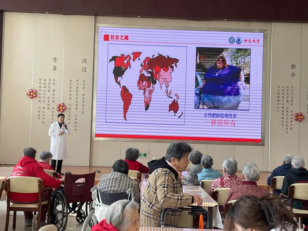 首先,徐州医科大学附属医院减重代谢外科邵永主任医师做了《中老年肥胖症的危害和防治》科普讲座。他结合康养中心的特殊性,针对老年人易发生的肥胖症伴发代谢性疾病糖尿病、高血压等心脑血管急症,重点讲授了肥胖症带来的严重损害及其防治措施等,提高了老年人在健康饮食、合理体重和科学运动等方面的意识。
