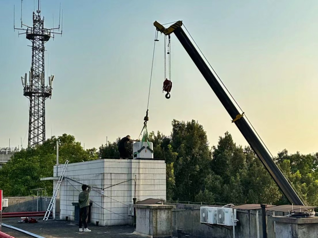 因无人机为精细设备,配送和运输过程中如遇到较大的撞击会造成机体损坏及数据等报错,安装过程需特别注意避免颠簸造成损坏,且设备安装在花果山楼顶,山路崎岖,山中绿化数目较多,需严格落实相关安全、用电、维护等事项要求。经过现场模拟等方式,工作人员最终通过使用吊机作业的形式部署,最大限度地保障施工安全与施工质量。