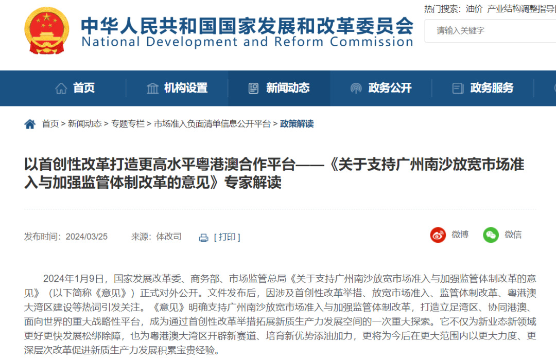 2024年1月9日,国家发展改革委、商务部、市场监管总局联合发布了《关于支持广州南沙放宽市场准入与加强监管体制改革的意见》。