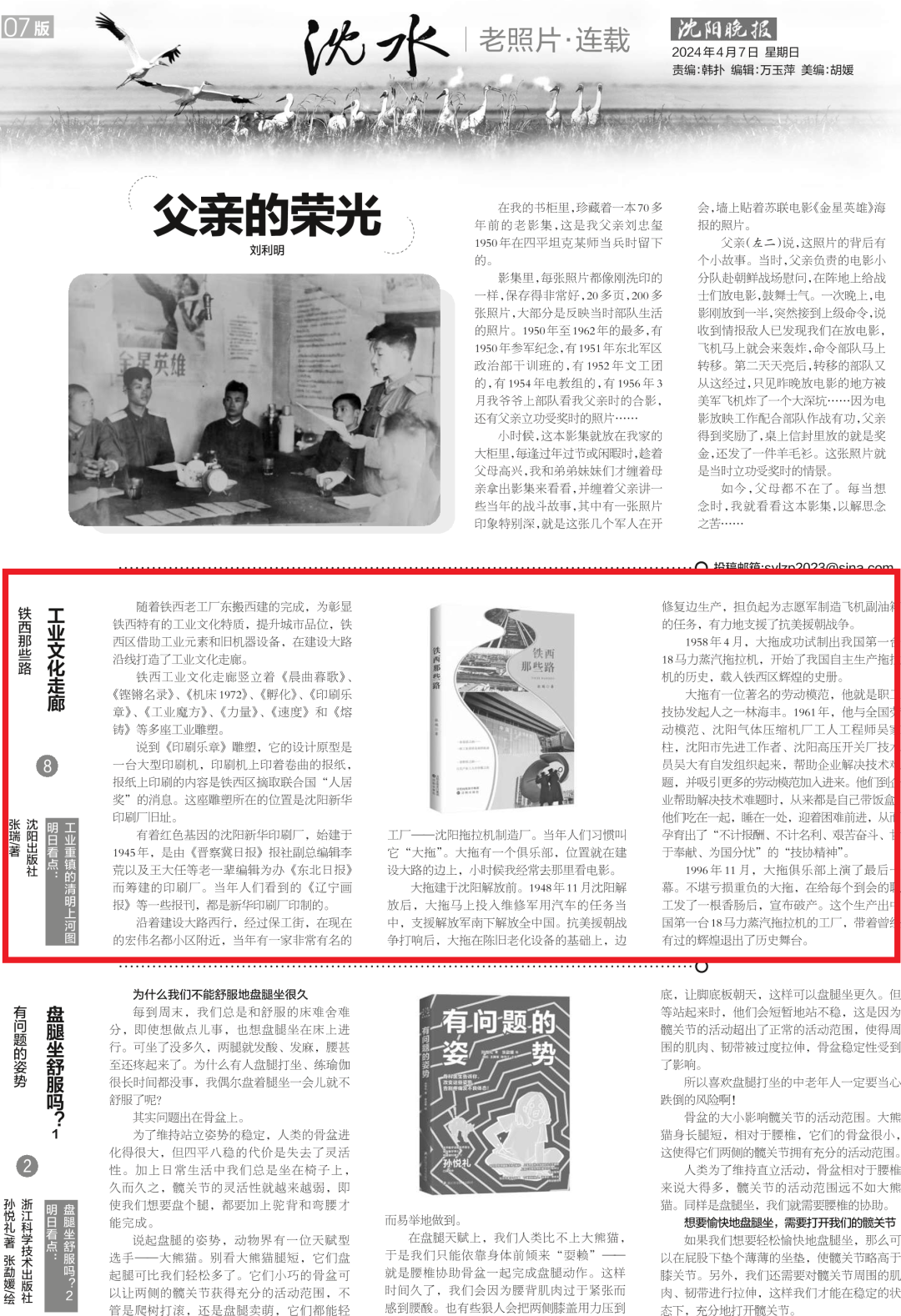 沈阳出版社 张瑞/著 随着铁西老工厂东搬西建的完成,为彰显铁西特有的工业文化特质,提升城市品位,铁西区借助工业元素和旧机器设备,在建设大路沿线打造了工业文化走廊。铁西工业文化走廊竖立着《晨曲暮歌》、《铿锵名录》、《机床1972》、《孵化》、《印刷乐章》、《工业魔方》、《力量》、《速度》和《熔铸》等多座工业雕塑。说到《印刷乐章》雕塑,它的设计原型是一台大型印刷机,印刷机上印着卷曲的报纸,报纸上印刷的内容是铁西区摘取联合国“人居奖”的消息。这座雕塑所在的位置是沈阳新华印刷厂旧址。有着红色基因的沈阳新华印刷厂,始建于1945年,是由《晋察冀日报》报社副总编辑李荒以及王大任等老一辈编辑为办《东北日报》而筹建的印刷厂。当年人们看到的《辽宁画报》等一些报刊,都是新华印刷厂印制的。沿着建设大路西行,经过保工街,在现在的宏伟名都小区附近,当年有一家非常有名的工厂——沈阳拖拉机制造厂。当年人们习惯叫它“大拖”。大拖有一个俱乐部,位置就在建设大路的边上,小时候我经常去那里看电影。大拖建于沈阳解放前。1948年11月沈阳解放后,大拖马上投入维修军用汽车的任务当中,支援解放军南下解放全中国。抗美援朝战争打响后,大拖在陈旧老化设备的基础上,边修复边生产,担负起为志愿军制造飞机副油箱的任务,有力地支援了抗美援朝战争。1958年4月,大拖成功试制出我国第一台18马力蒸汽拖拉机,开始了我国自主生产拖拉机的历史,载入铁西区辉煌的史册。大拖有一位著名的劳动模范,他就是职工技协发起人之一林海丰。1961年,他与全国劳动模范、沈阳气体压缩机厂工人工程师吴家柱,沈阳市先进工作者、沈阳高压开关厂技术员吴大有自发组织起来,帮助企业解决技术难题,并吸引更多的劳动模范加入进来。他们到企业帮助解决技术难题时,从来都是自己带饭盒。他们吃在一起,睡在一处,迎着困难前进,从而孕育出了“不计报酬、不计名利、艰苦奋斗、甘于奉献、为国分忧”的“技协精神”。1996年11月,大拖俱乐部上演了最后一幕。不堪亏损重负的大拖,在给每个到会的职工发了一根香肠后,宣布破产。这个生产出中国第一台18马力蒸汽拖拉机的工厂,带着曾经有过的辉煌退出了历史舞台。